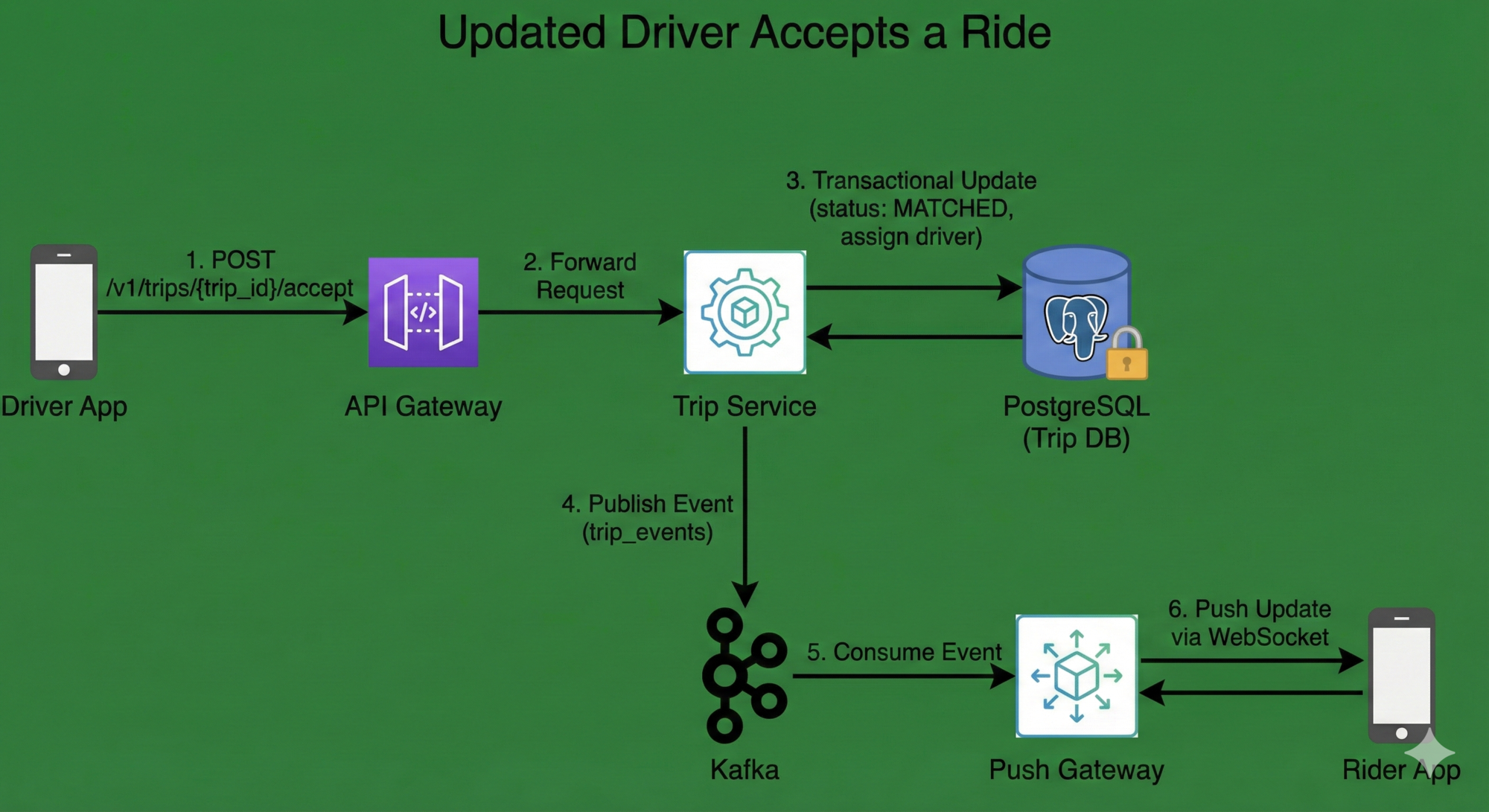 POST /acceptrequest to the Trip Service. - The Trip Service validates the request.