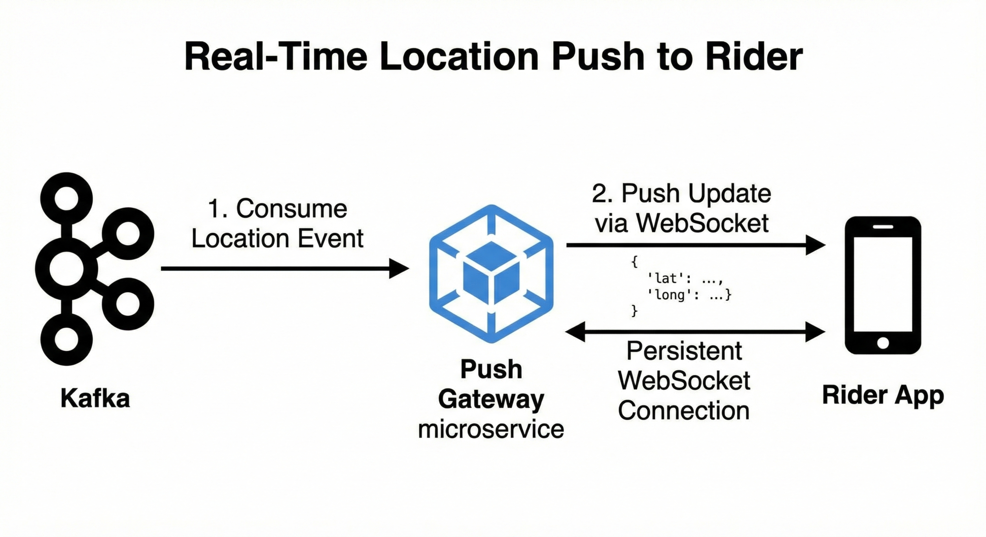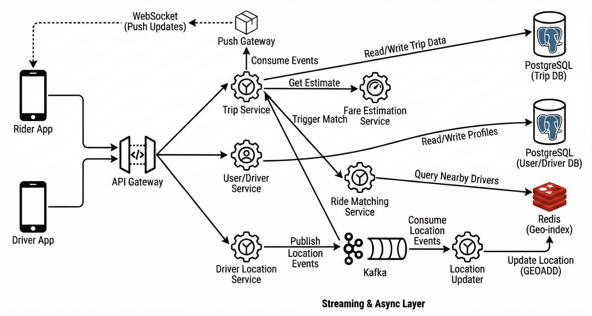 Driver → API Gateway → Trip Service → Kafka → Push Gateway → Rider App