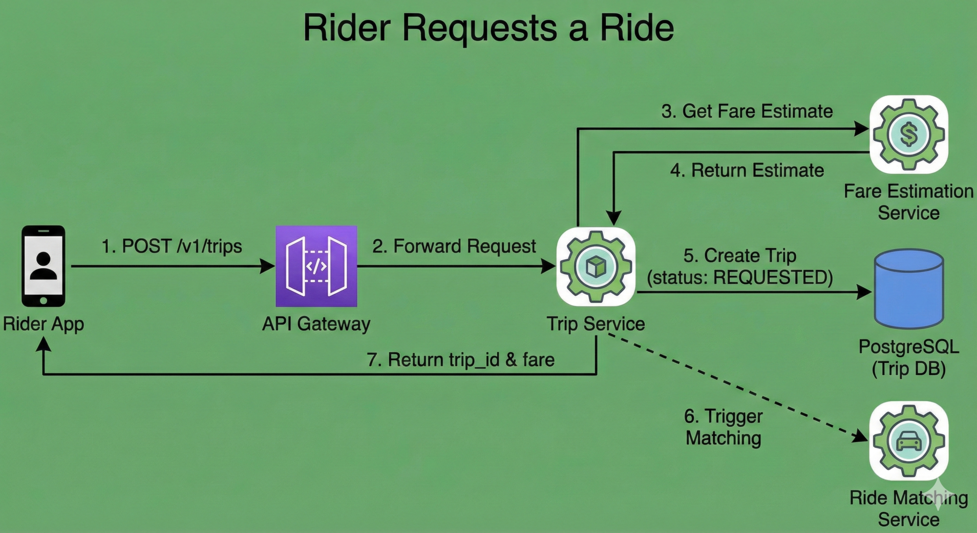 Rider → API Gateway → Trip Service → Ride Matching Service